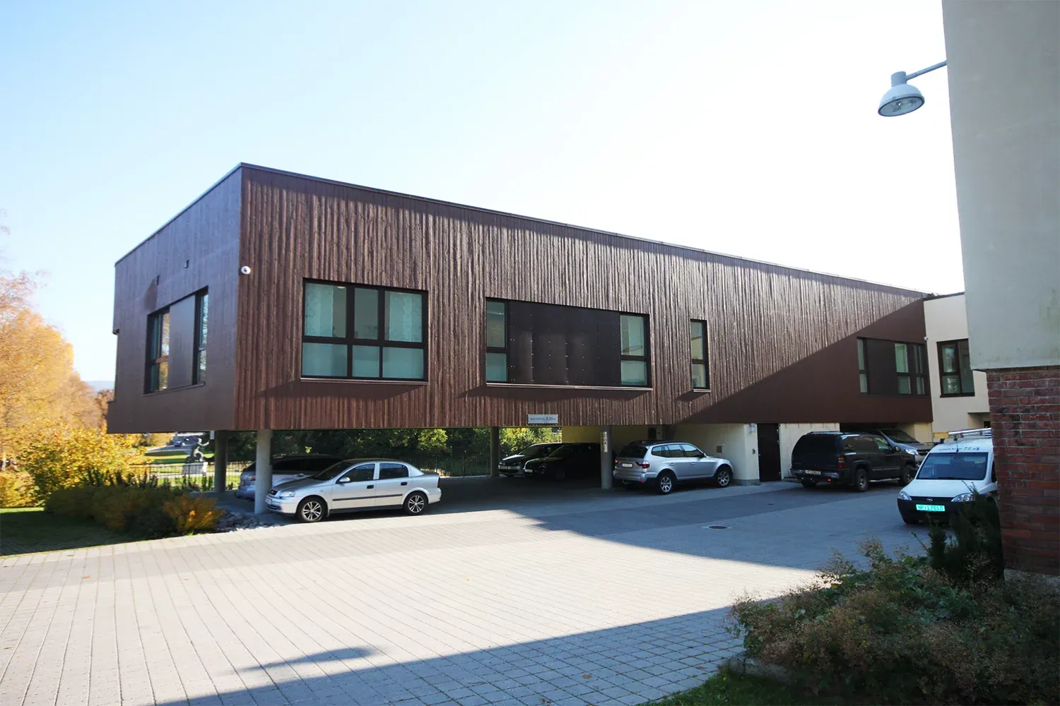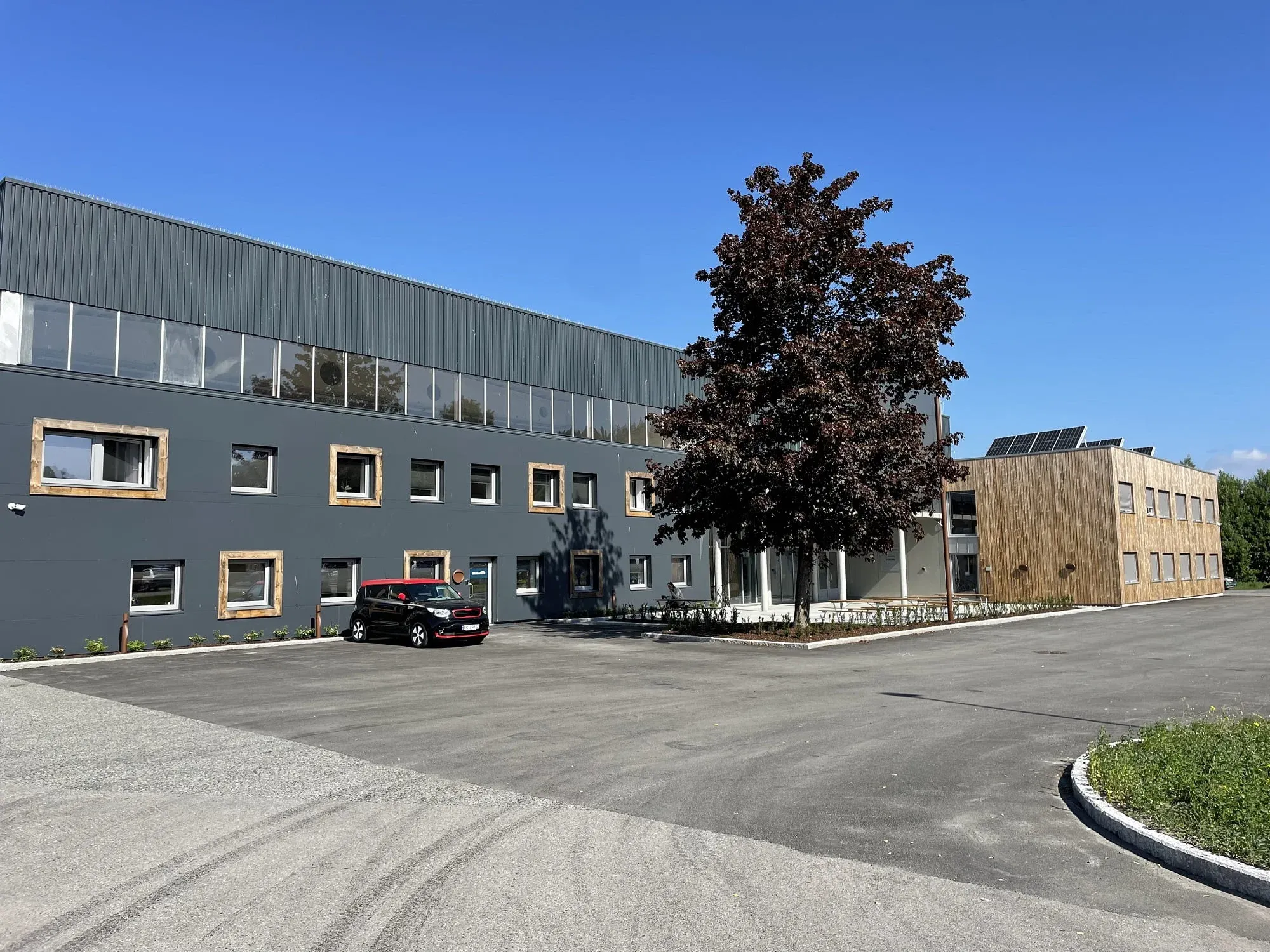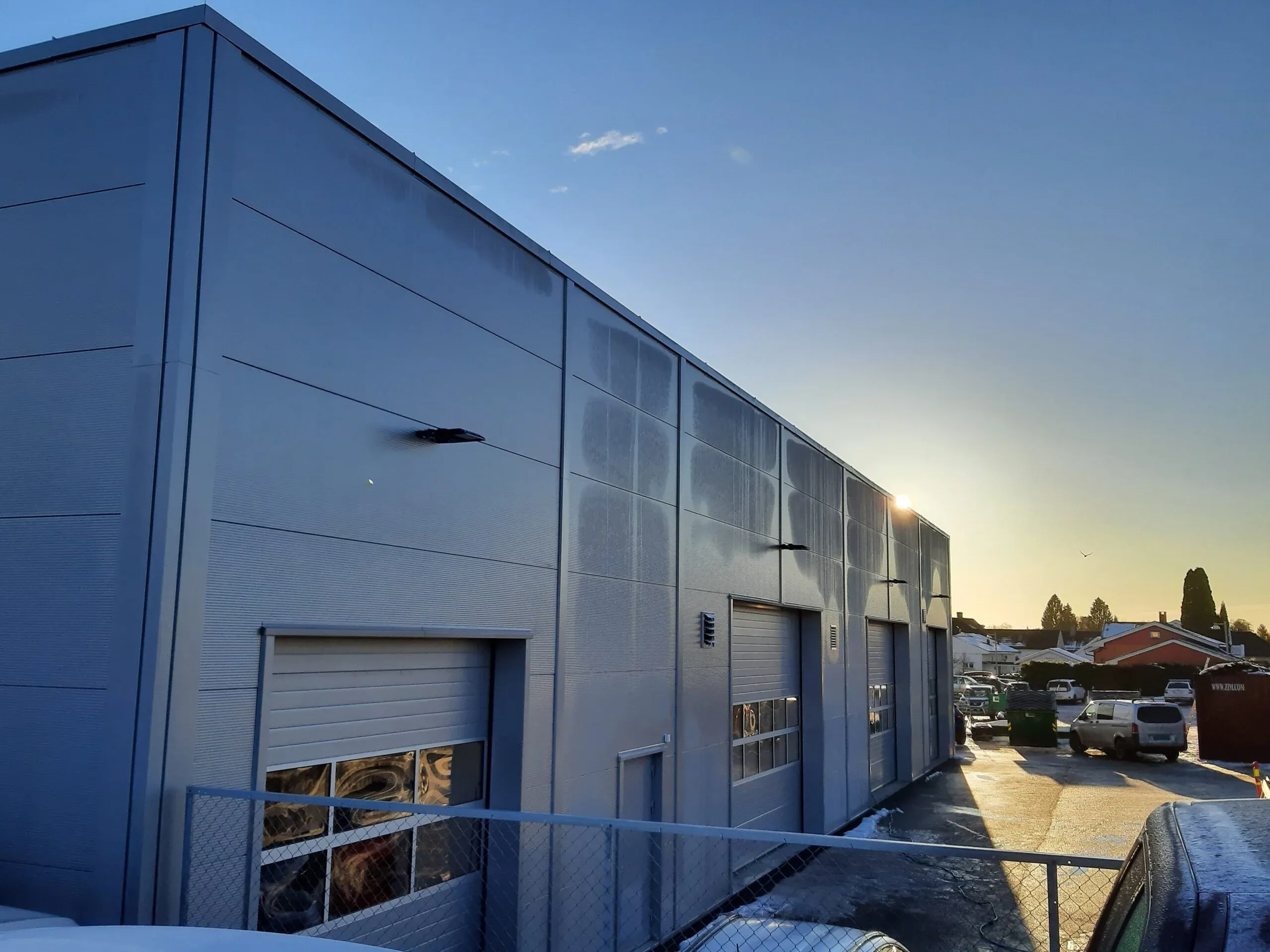 Hagebyveien 33 på Kjørbekk i Skien har fått oppgradert fasader, tak, innvendig rehabilitert med nye tekniske anlegg og et nytt mellombygg mellom de to bygningene. Verktøy.no, NFH (Norwegian Fastenere House) og Solar holder til i bygget.