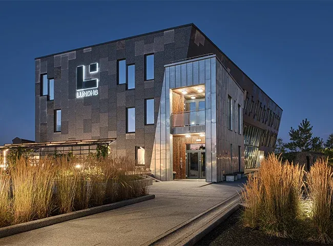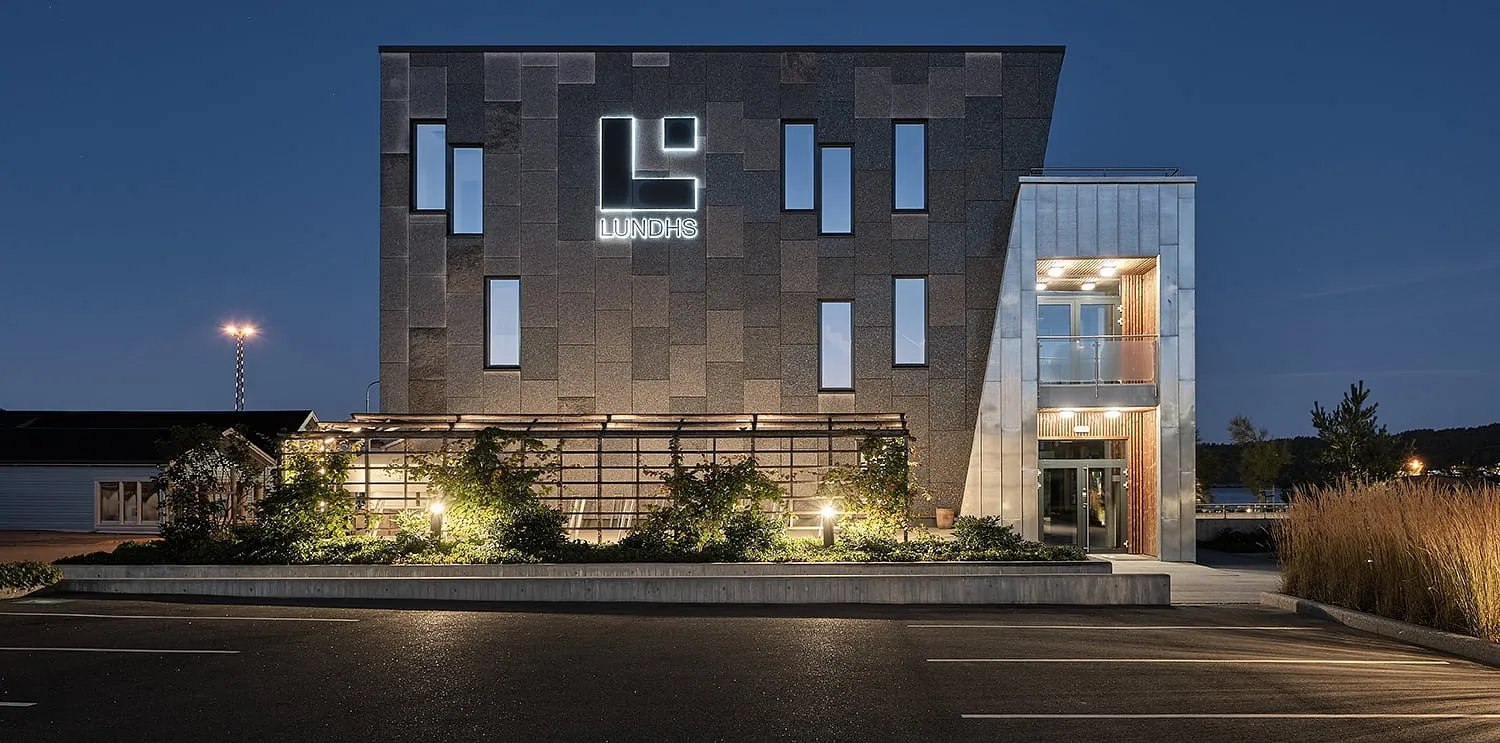 Lundhs nye hovedkontor ligger ved sjøen på Torstrand i Larvik. Bygget består av 3 etasjer og full parkeringskjeller.